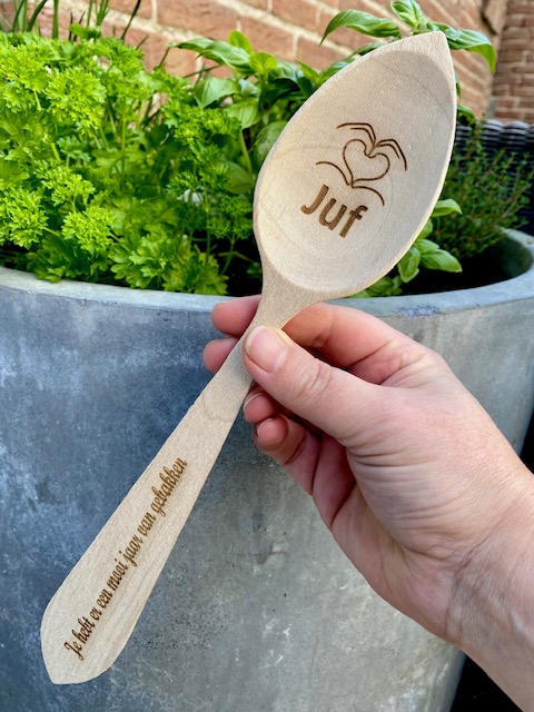Met in de lepel gegraveerd een populaire ‘handen maken een hart’ emoji en het woord juf.