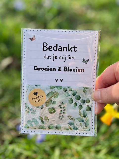 Deze bedank kaart met wilde bloemzaden is het perfecte kleinigheidje om de juf, meester of je stage begeleider mee te bedanken, verpakt in een hersluitbaar plastic zakje met daarop een ‘Thank You’ sticker. Er is ruimte voor een persoonlijke boodschap op de achterkant van de kaart.